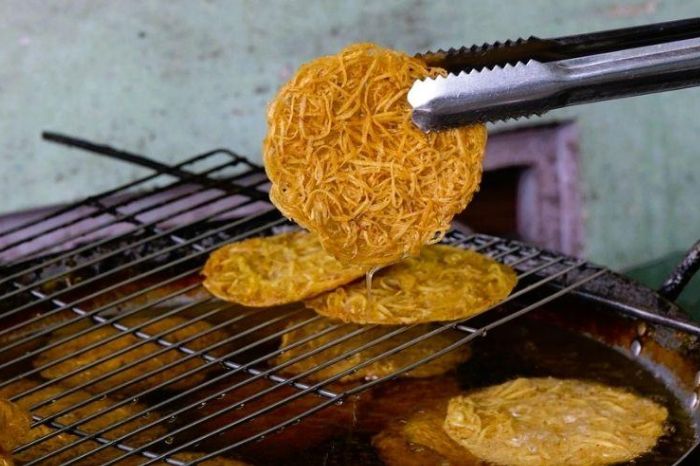 - Bước 3 – chiên bánh: Đun sôi chảo dầu, cho bánh đã tạo hình vào chiên ngập mặt trên lửa vừa. Khi bánh chuyển sang màu vàng nâu đẹp mắt và bắt đầu giồn thì có thể vớt ra, để trên giấy thấm dầu cho ráo.
