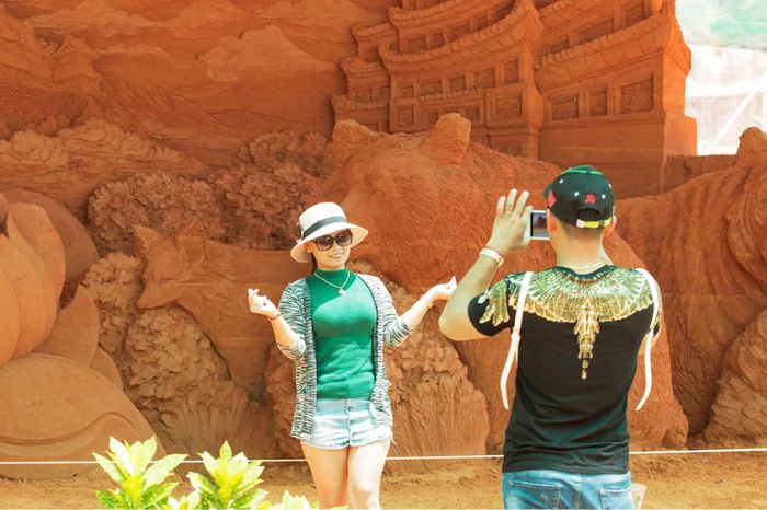 - Nếu bạn muốn có bức ảnh đẹp, hãy lựa chọn góc chụp sáng tạo, tận dụng các chi tiết tinh xảo của tượng cát.