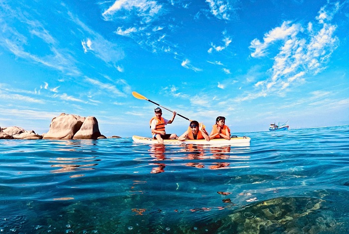 Cạnh đó, Bãi Tiên, Bãi San Hô được biết đến là những địa điểm lý tưởng để vừa tắm biển, vừa chèo SUP. Đây là một hoạt động vô cùng thú vị khi cảm nhận được làn nước trong xanh dưới chân, ngắm nhìn những rạn san hô rực rỡ đung đua dưới nước cũng như các bãi đá với hình thú độc đáo.