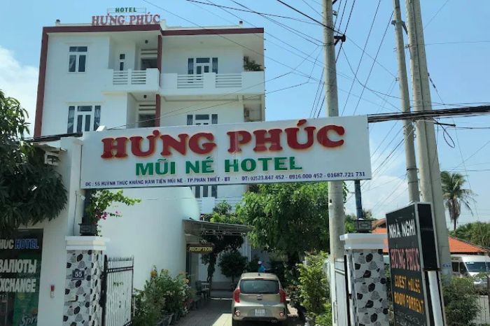 Khách sạn Hưng Phúc nằm cách trung tâm Phan Thiết khoảng 20km, ẩn mình dưới rặng dừa xanh mát, tươi tốt quanh năm. Khách sạn gây ấn tượng bởi phong cách thiết kế hiện đại, tươi sáng với hai gam màu đỏ – trắng chủ đạo.