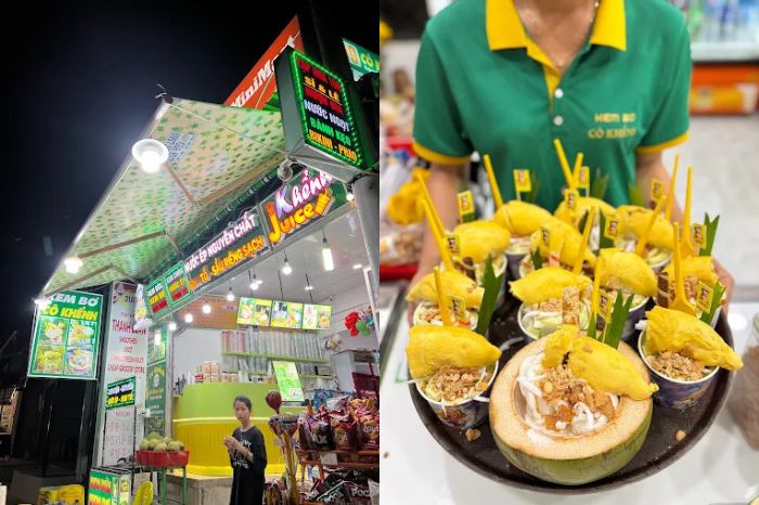 Điểm cộng của quán kem dừa cô Khểnh là món kem bơ múi sầu riêng độc đáo được chế biến từ trái bơ và múi sầu riêng ngon nhất kết hợp dừa bào, đậu phộng rang. Ngoài ra, quán còn phục vụ nhiều món kem trứ danh khác như kem trà xanh, kem socola, kem dâu tây…