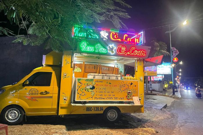 Quán kem Cô Loan thu hút du khách bởi cách bán hàng trên chiếc xe bán tải lưu động. Xe có màu vàng rực rỡ, xuất hiện trên nhiều tuyến đường sầm uất và thường cắm chốt ở bãi đá Ông Địa.