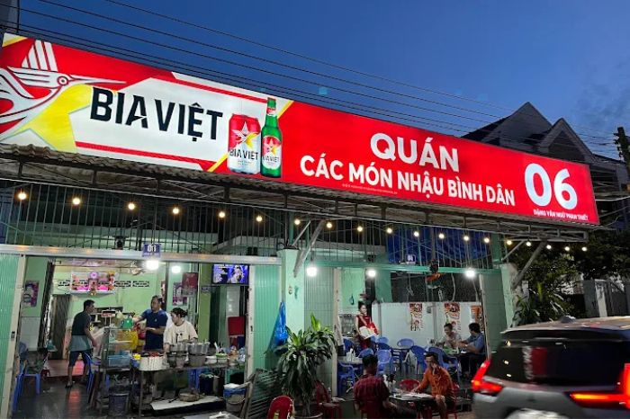 Quán nhậu hải sản bình dân Phan Thiết 06 quán tọa lạc ngay trung tâm thành phố Phan Thiết cũ. Nơi đây đa dạng các món hải sản được chế biến nướng, hấp, xào nấu tùy theo sở thích của thực khách.