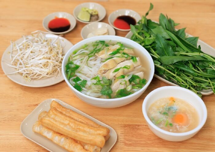 Đi kèm mỗi tô phở luôn có rau thơm, giá đỗ. Bạn có thể chọn phở bò, gân mềm, bò viên,… Giá bình quân 55.000đ/tô, nếu thêm trứng thì 6.000đ/quả.