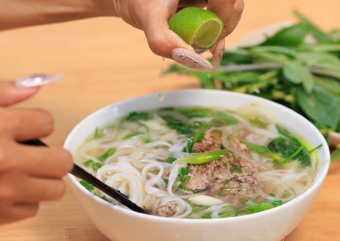 - Khi ăn phở, bạn nhớ cho giá, rau thơm, ngò gai, thêm chút tương ớt, tương đen và vắt thêm chút chanh. Nếu ăn được cay thì thêm chút ớt tươi hoặc sa tế sẽ trọn vị hơn.
